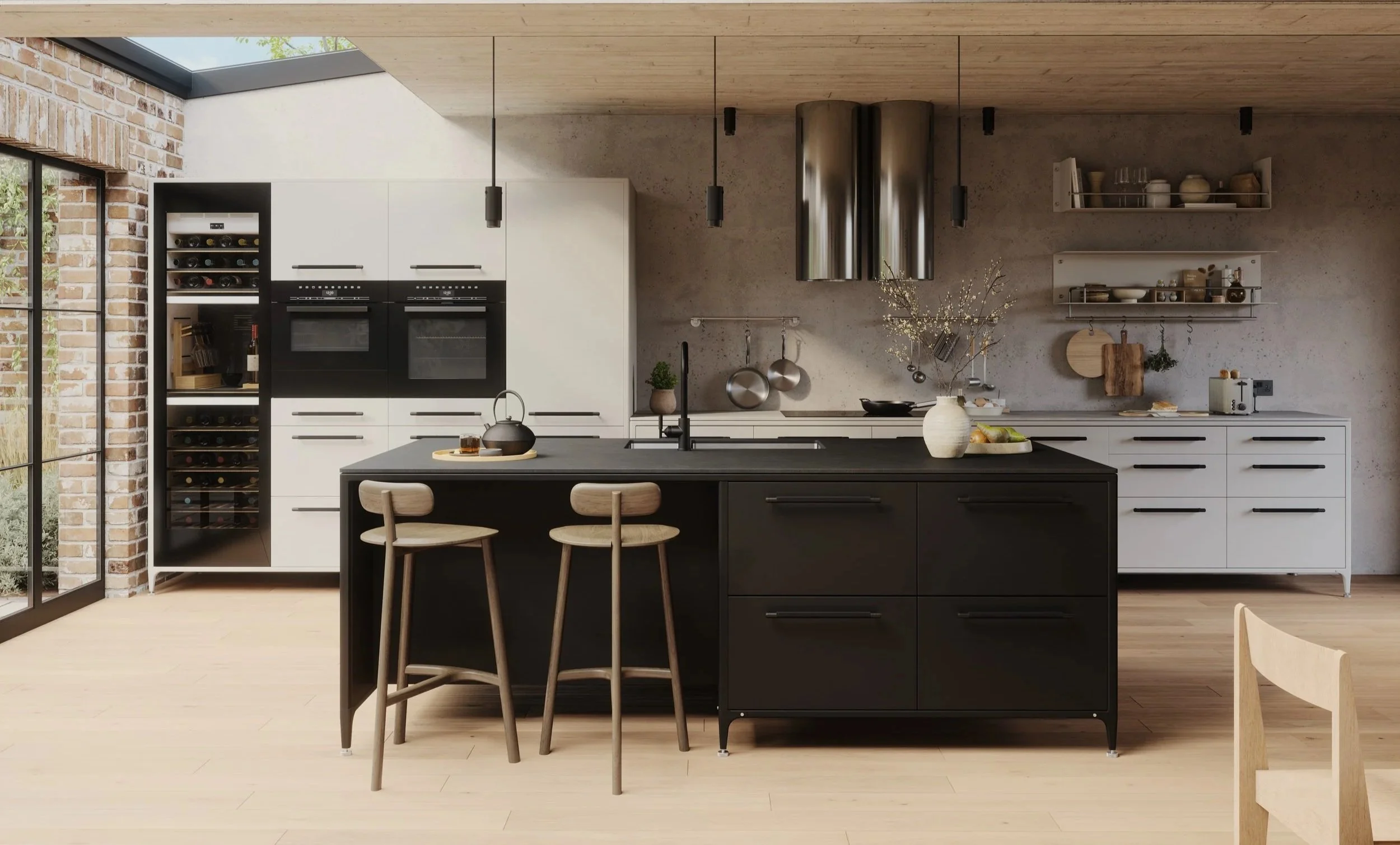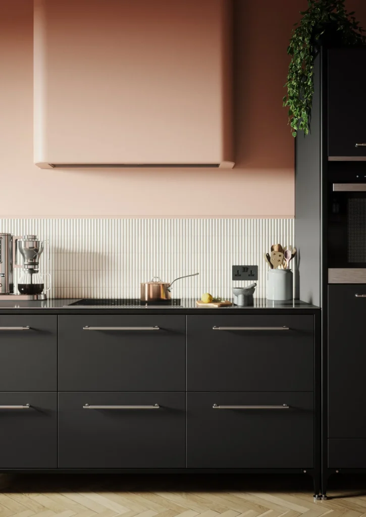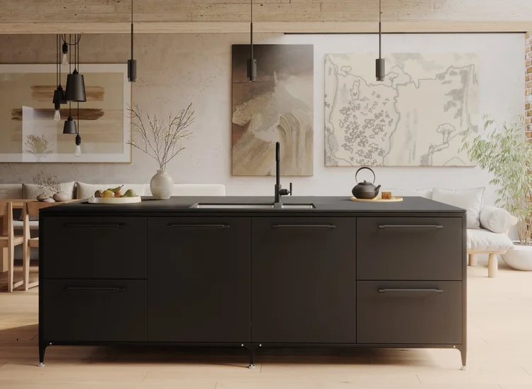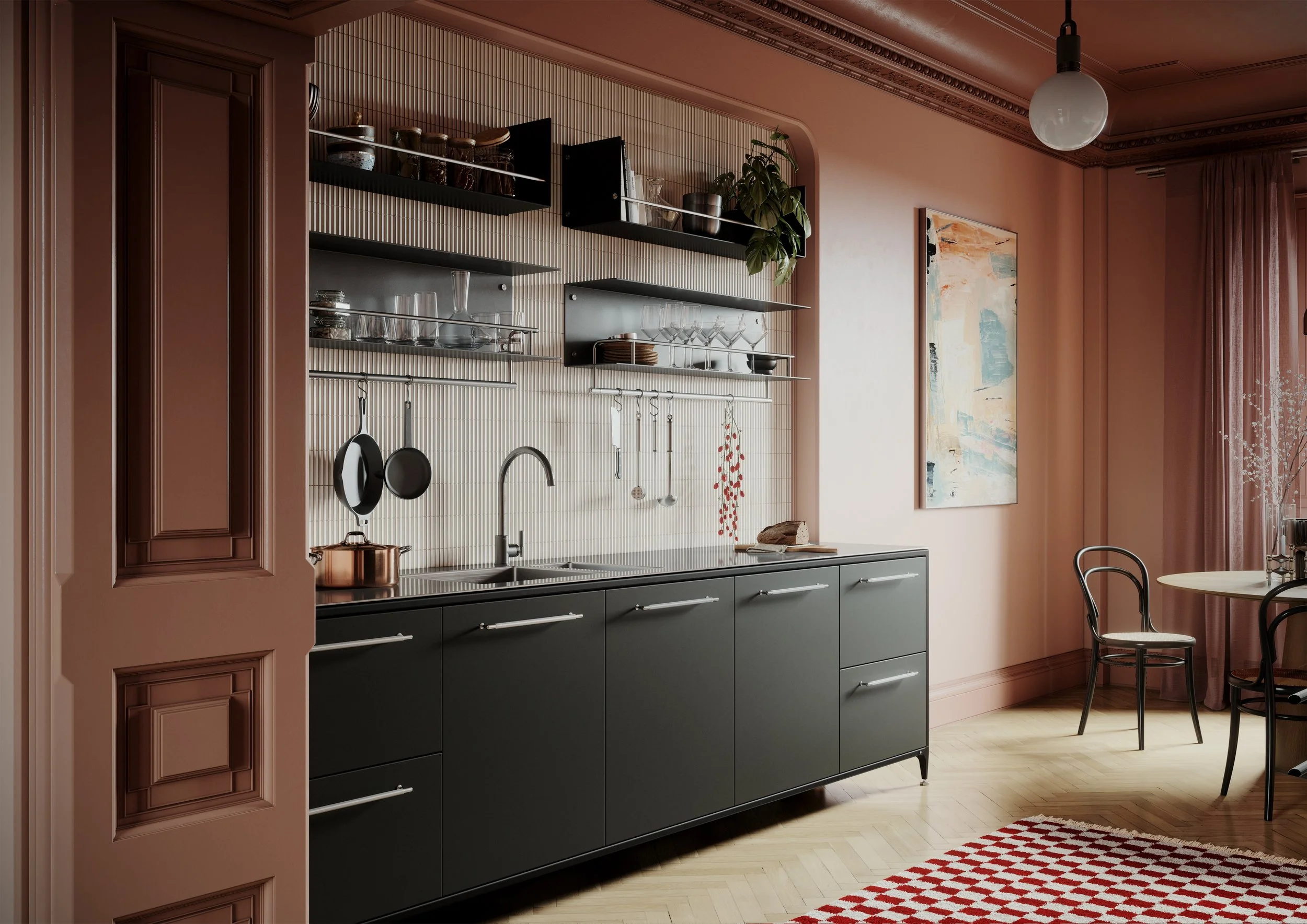 Mobilierul îndrăzneț în nuanțe de negru mat contrastează cu pereții în pasteluri delicate, transformând corpurile de bucătărie în punctul central al încăperii. Designul freestanding este aerisit, dar bine ancorat vizual, păstrând simplitatea specifică stilului scandinav — adaptabil, elegant și perfect pentru ritmul vieții urbane.