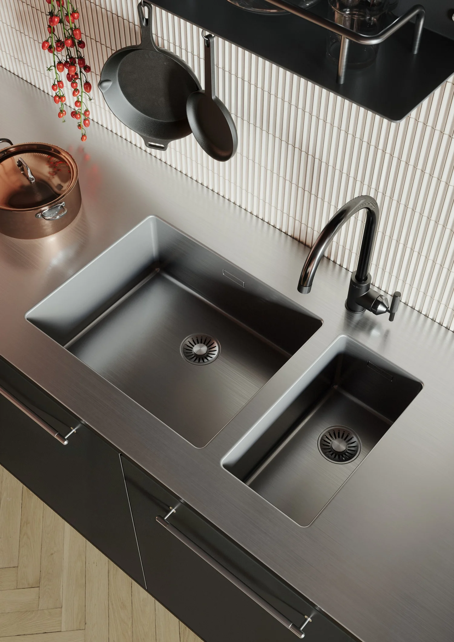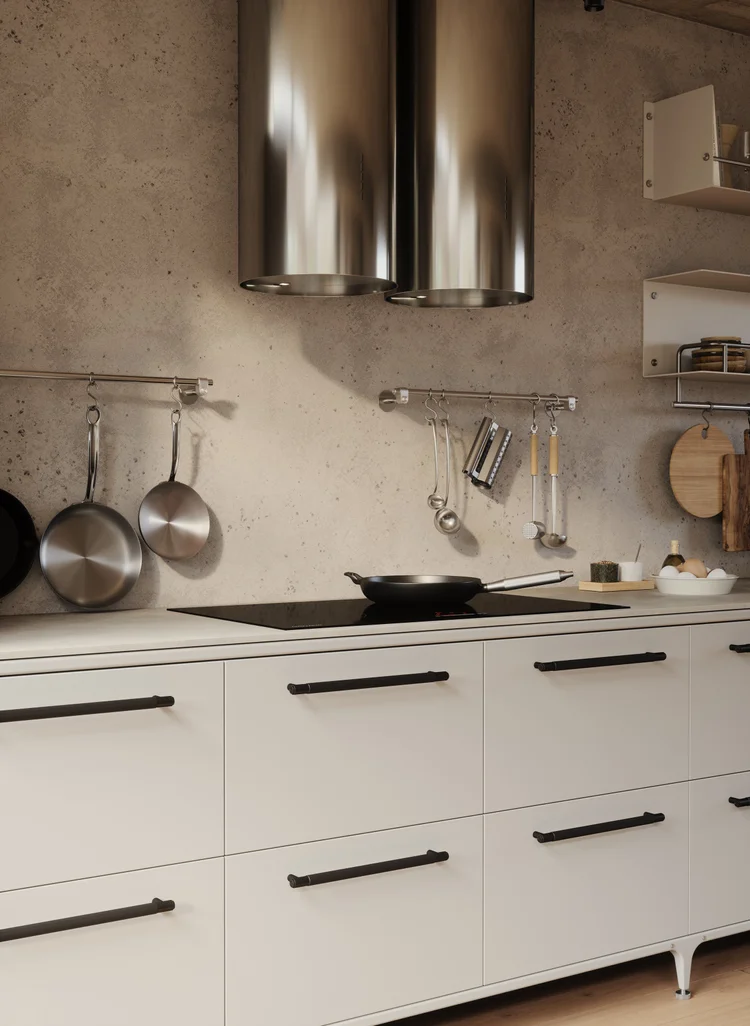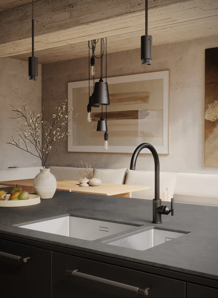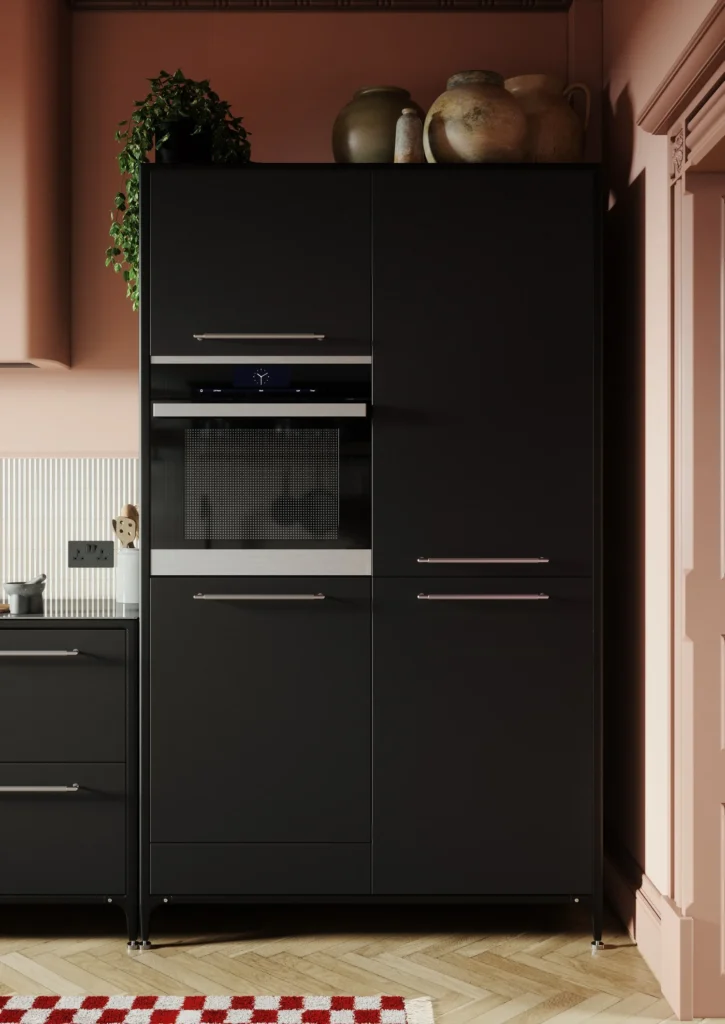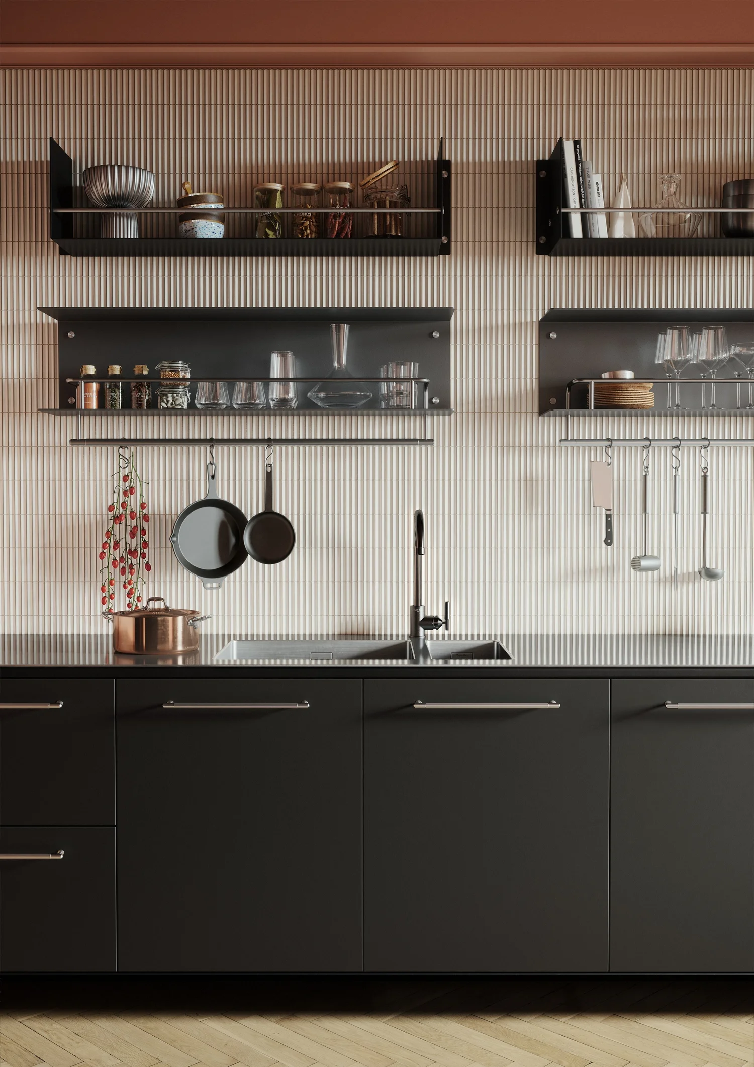 Mobilierul îndrăzneț în nuanțe de negru mat contrastează cu pereții în pasteluri delicate, transformând corpurile de bucătărie în punctul central al încăperii. Designul freestanding este aerisit, dar bine ancorat vizual, păstrând simplitatea specifică stilului scandinav — adaptabil, elegant și perfect pentru ritmul vieții urbane.